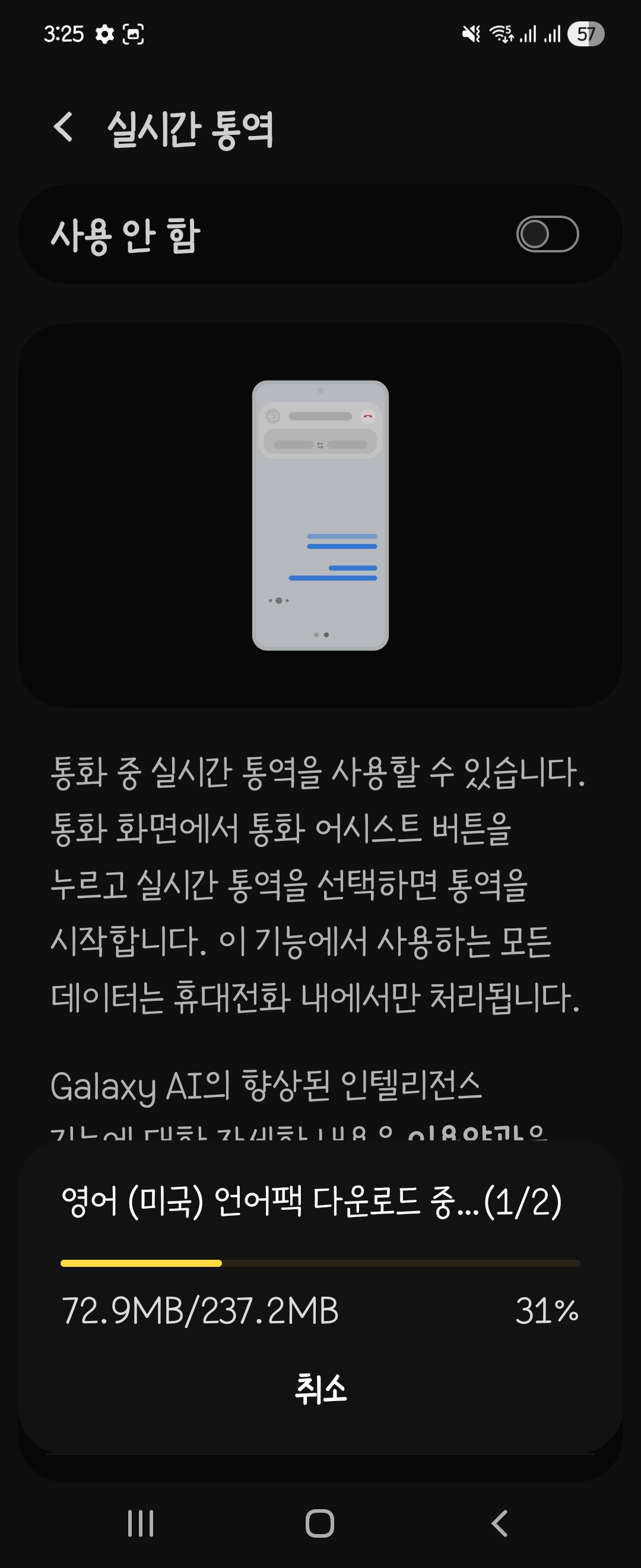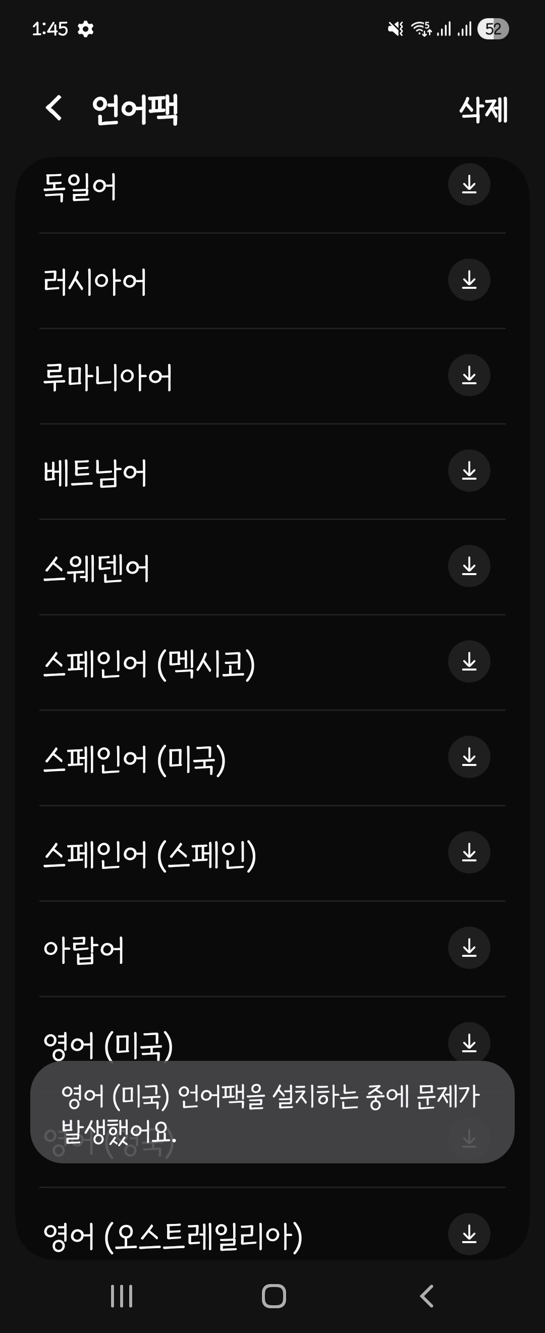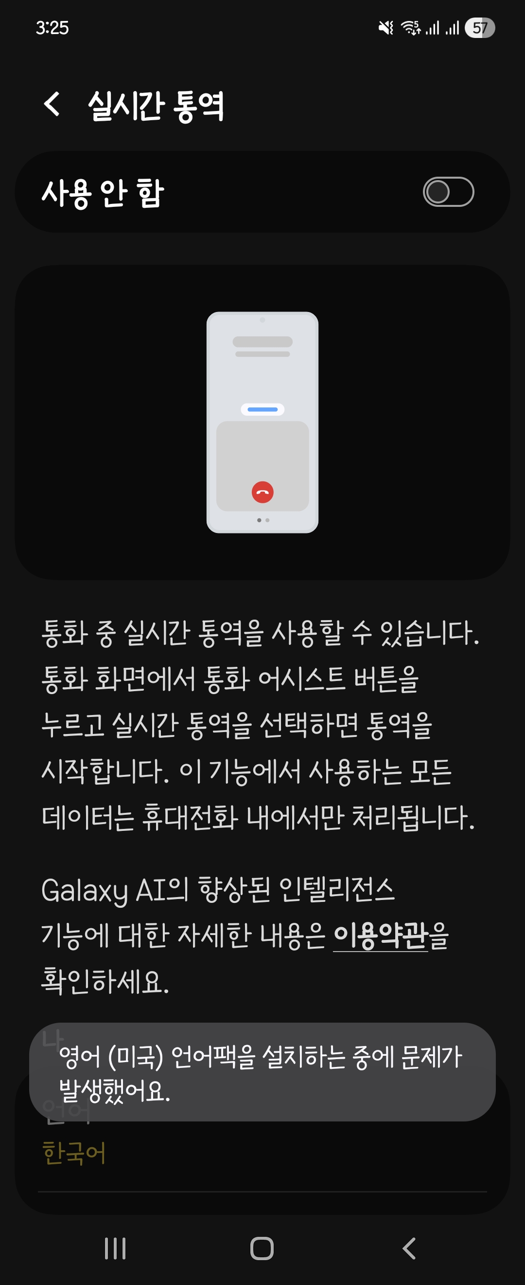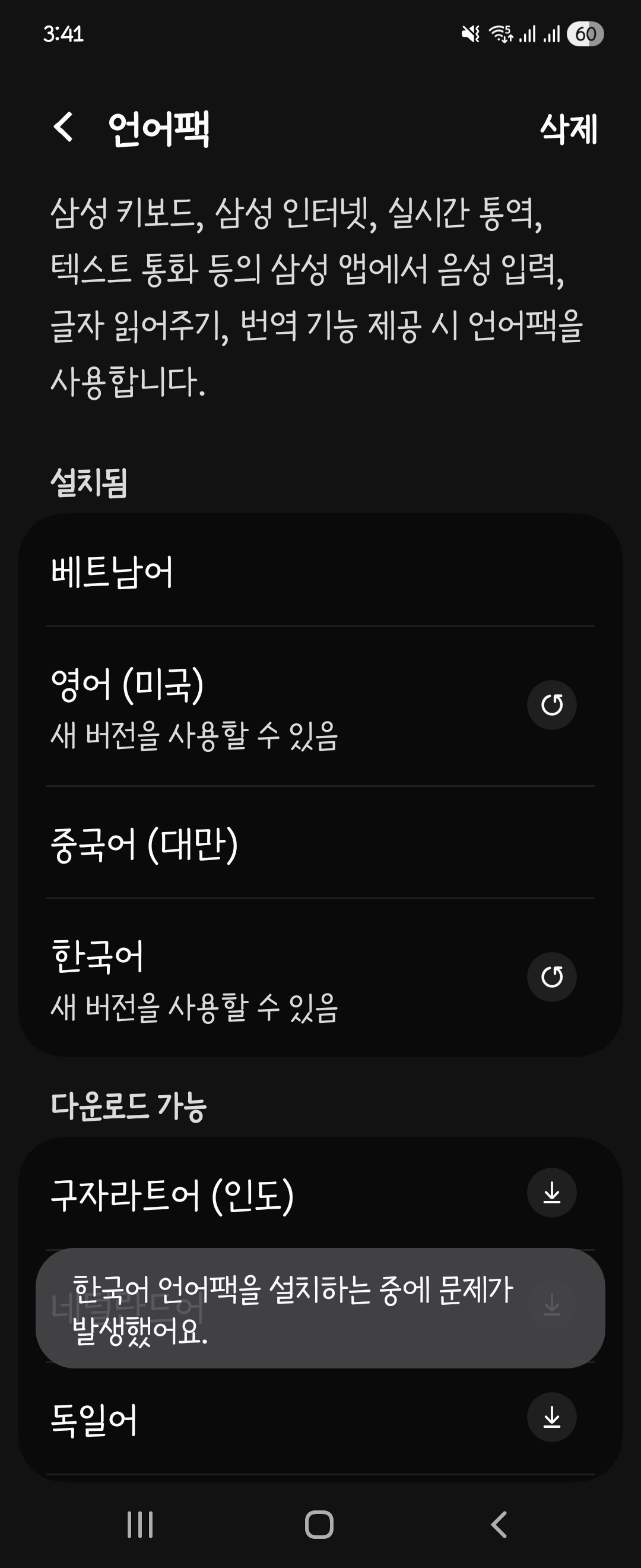 실시간 통역 등을 쓰기위해 한국어 팩이랑 영어 팩을 설치 하려면 오류가 발생함